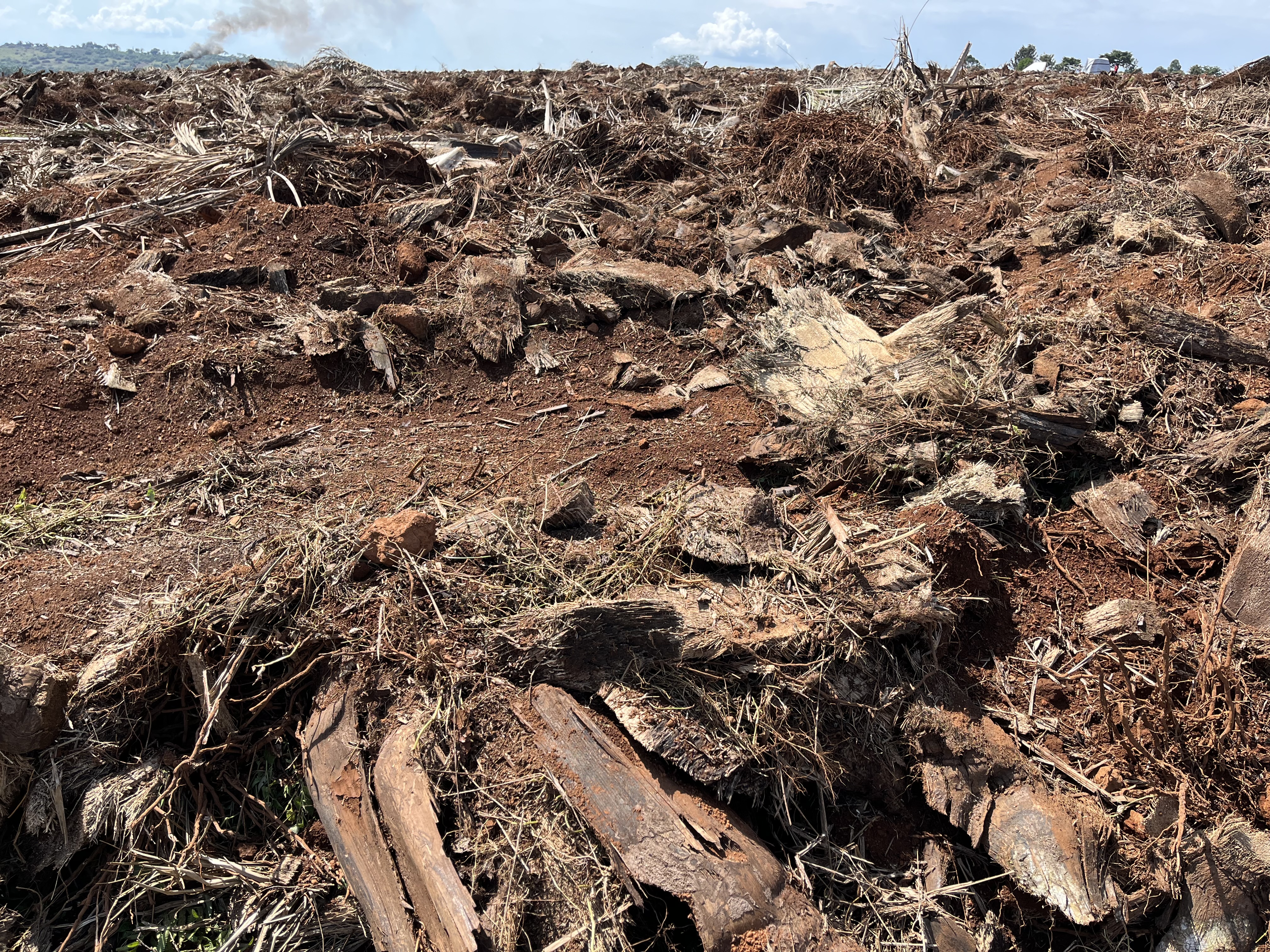 Parcelle en phase de replantation (abattage et découpage des palmiers avant replantation).