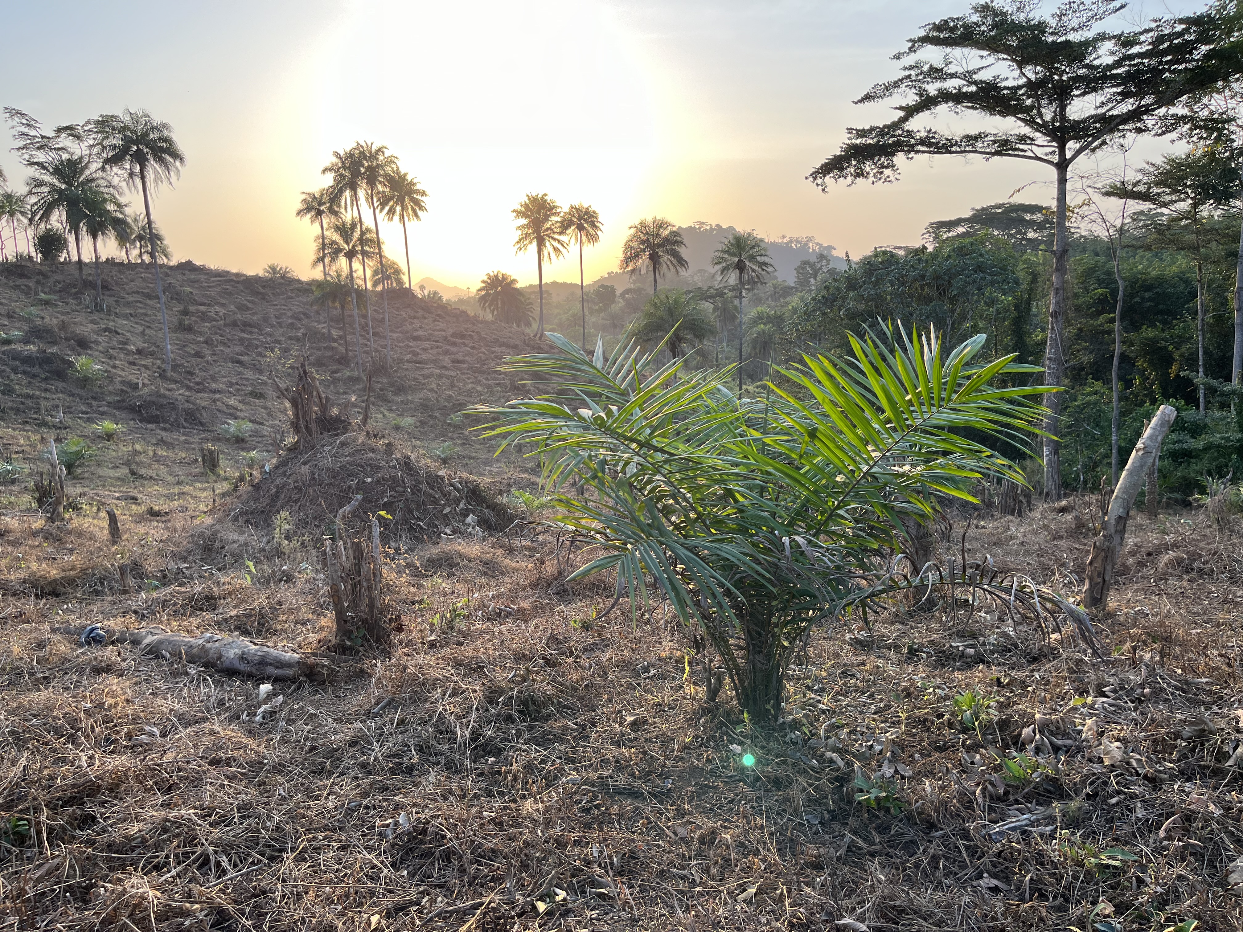 palmiers spontanés (arrière plan) dont les feuilles âgées peuvent être élaguées et transportées au pied des jeunes palmiers